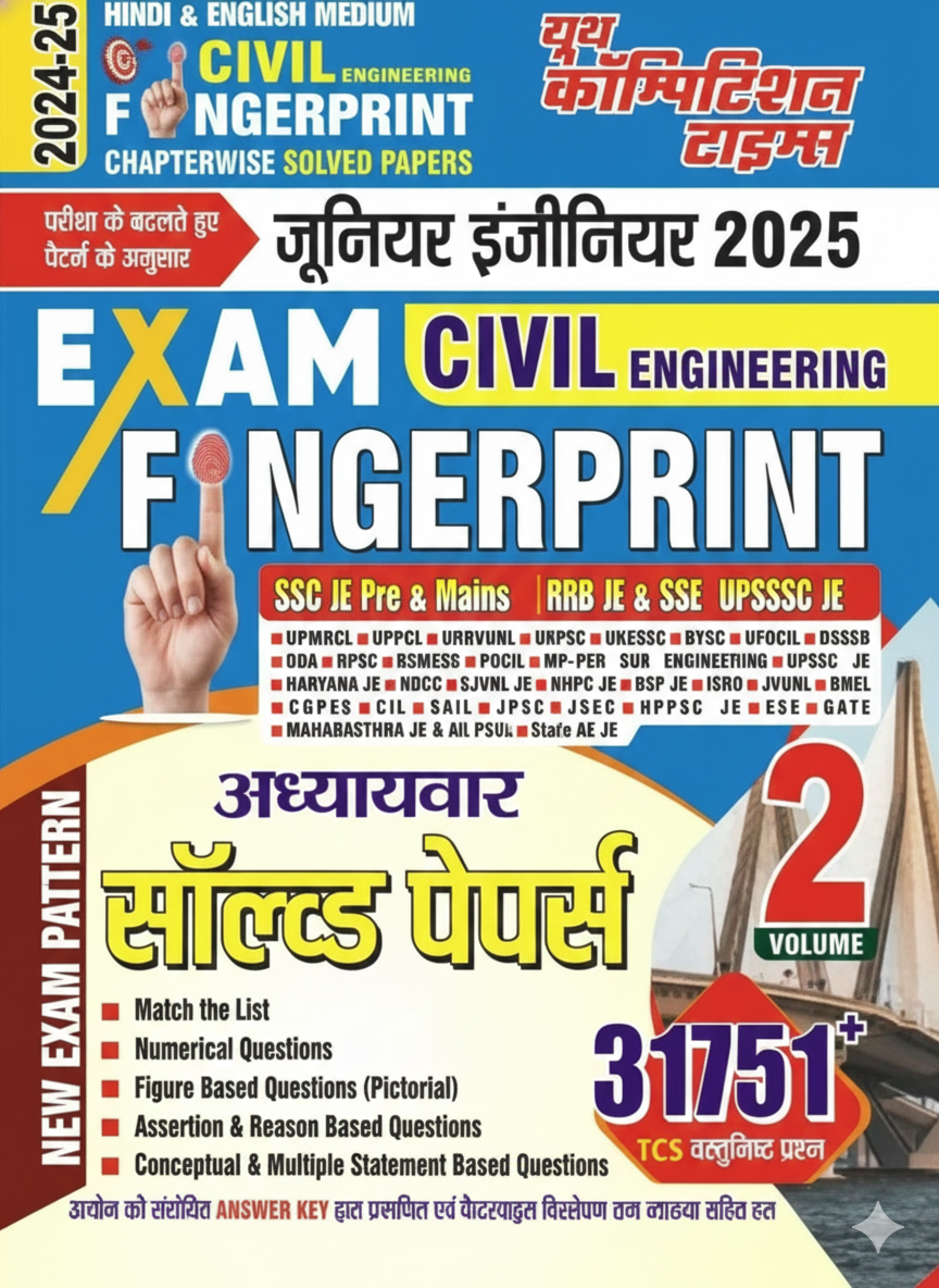 This book is a comprehensive resource published by Youth Competition Times (YCT), specifically designed for aspirants of Civil Engineering competitive exams. Titled "Civil Engineering Fingerprint Chapterwise Solved Papers (Volume 2)," it serves as an essential guide for the 2024-25 and 2025 Junior Engineer (JE) exams.