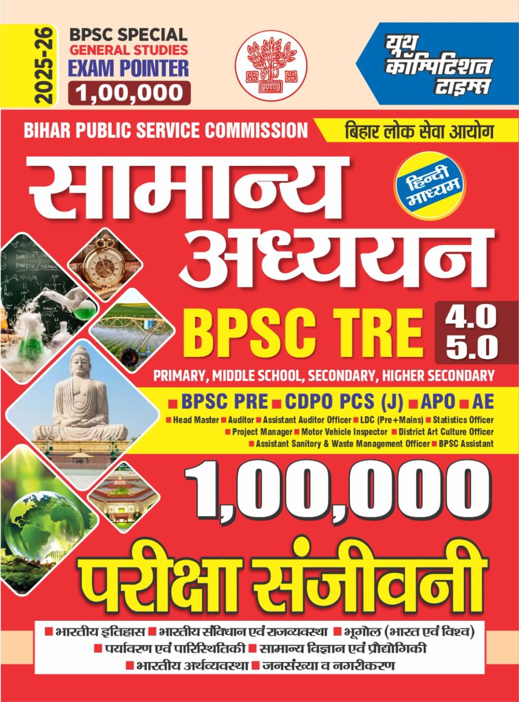 This book is a specialized study resource titled BPSC Special General Studies Exam Pointer (Pariksha Sanjeevani), published by Youth Competition Times for the 2025-26 exam cycle. It is designed as a high-speed revision tool for candidates preparing for various Bihar Public Service Commission (BPSC) examinations, including TRE 4.0 & 5.0 (Teacher Recruitment Exams).