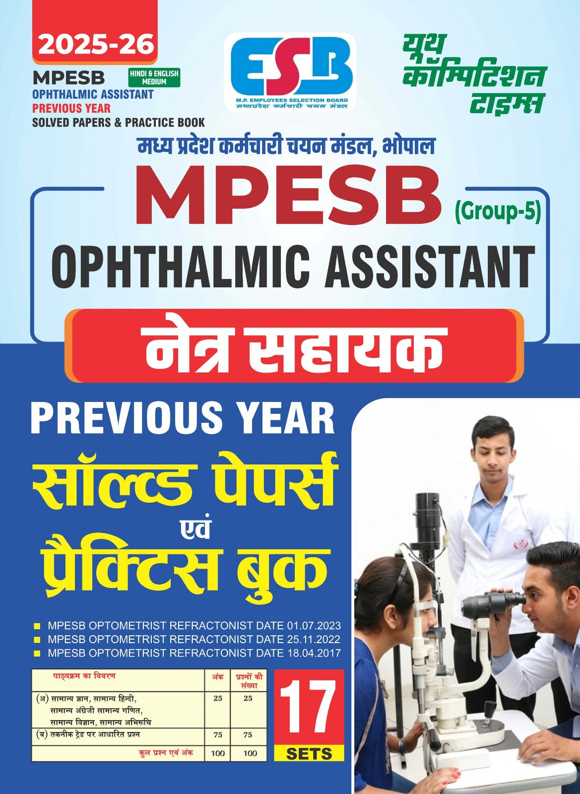 This is the MPESB Ophthalmic Assistant (नेत्र सहायक) Previous Year Solved Papers & Practice Book, published by Youth Competition Times (युथ कॉम्पिटिशन टाइम्स) for the 2025-26 exam cycle.