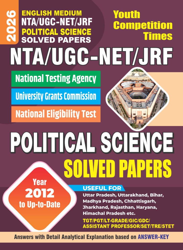 A study guide titled "NTA/UGC-NET/JRF Political Science Solved Papers" published by Youth Competition Times for the 2026 exam cycle.
