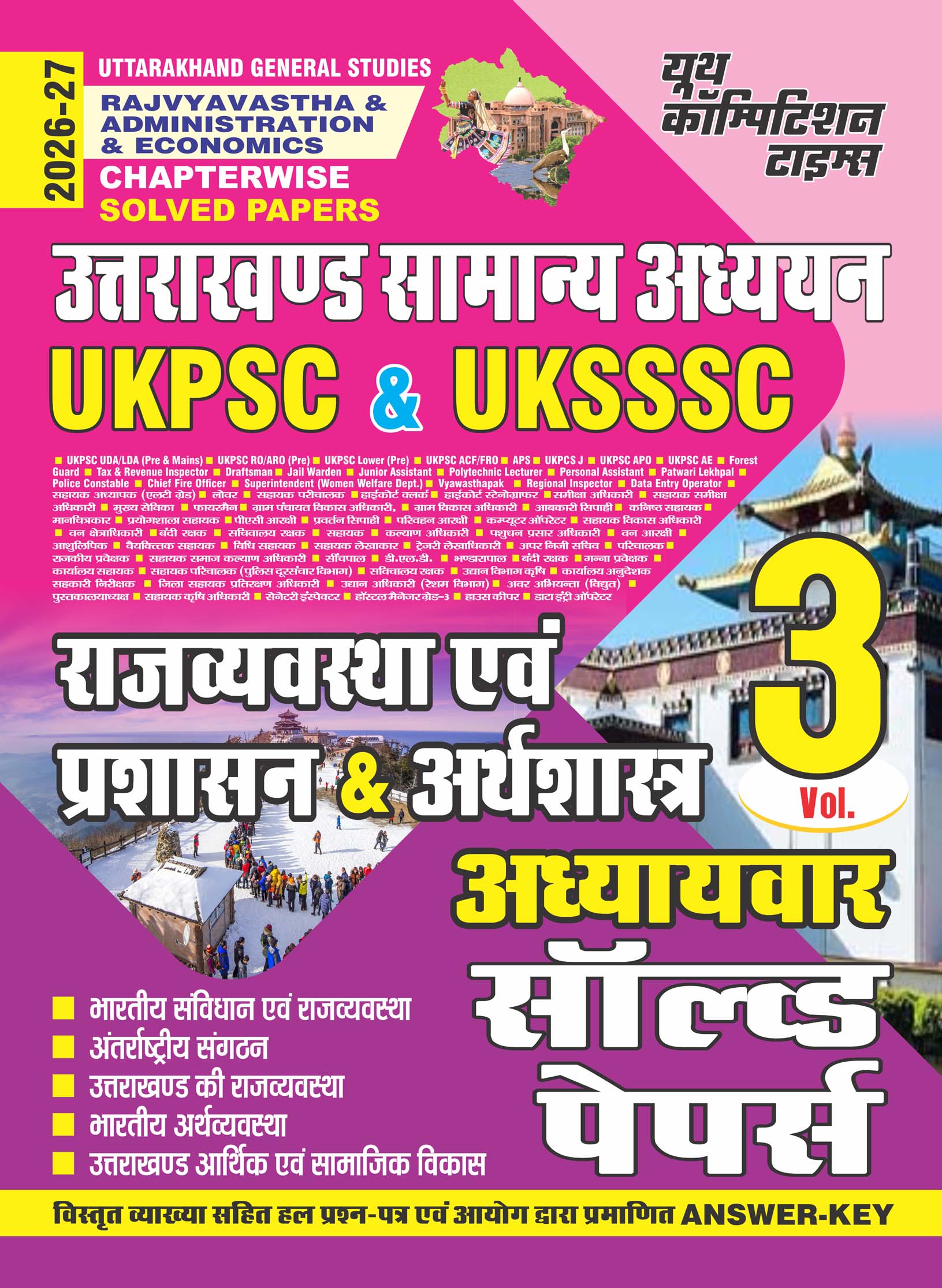 This image is the cover of a study guide titled "Uttarakhand General Studies: Rajvyavastha & Administration & Economics Chapterwise Solved Papers," published by Youth Competition Times.
